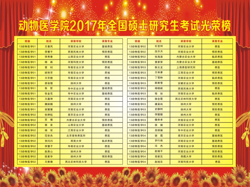 日前,2017年全国硕士研究生入学统一招考工作已基本接近尾声,动物医学院首届本科毕业生考研成绩喜人,84人参加国家研究生入学考试,报考人数占本科毕业生总数的50.6%;66人达到国家划定的初试合格分数线,上线人数占参加考试总数的78.5%;46人已确定被西北农林科技大学、华南农业大学、华中农业大学、南京农业大学、西南大学、扬州大学等院校录取,录取人数占参加考试总数的54.7%,占考研上线人数的69.7%,占本科毕业生总数的27.7%。特别值得一提的是,13级动物医学3班侯会霞同学以416分的初试成绩名列西北农林科技大学兽医类专业考生第一。