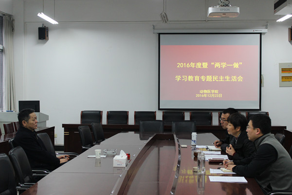 ,动物医学院在生工组团C401会议室召开2016年度暨 “两学一做”学习教育专题民主生活会。校党委书记王保国到会指导,学院领导班子成员参加会议。会议由学院党总支书记王春明主持。