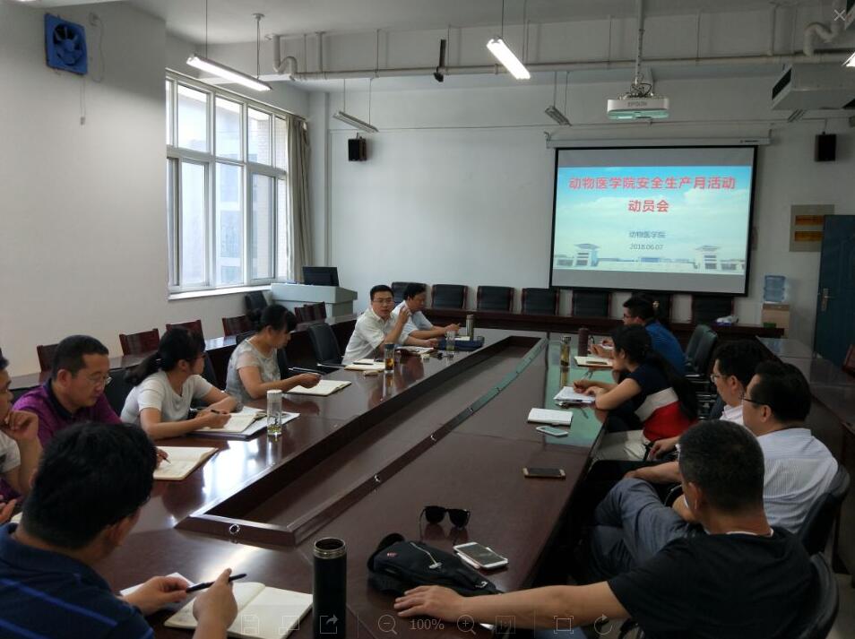 6月7日下午,动物医学院在生工组团C401会议室召开实验室安全生产月活动动员会,全体实验员教师、教研室主任和各科研实验室负责人参加会议,会议由副院长宋予震主持。
