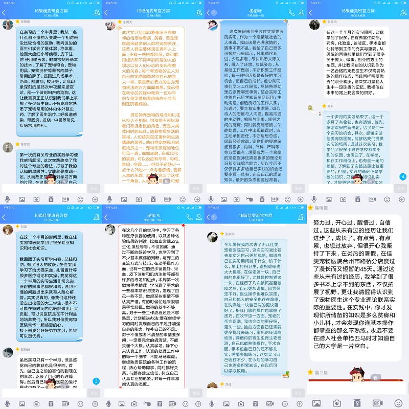 培训结束后,同学们满怀热情和期待开始出发去自己被分配的医院。实习的过程中,同学们本着认真、负责的学习态度,在实习岗位上注重理论与实践的结合,并向指导老师请教学习了宠物诊疗的基本实操技术。实习期间内容丰富,形式多样,通过维持医院环境卫生、前台导诊、跟诊、观摩手术、住院宠物的护理、协助医生使用B超仪和拍摄X光机等实习环节,使同学们熟练掌握患病动物的病历档案的建立、保定、注射、输液、测体温、洗耳朵、剪指甲等重要技术。