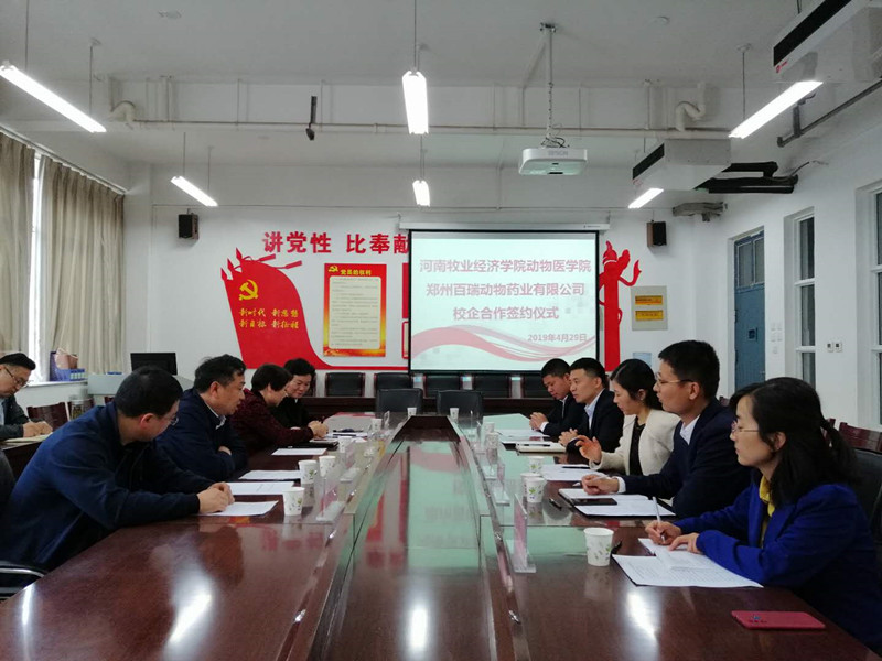为充分发挥动物医学院和郑州百瑞动物药业公司在信息、科研、人才、技术等方面的优势,促进产、学、研互动交流,资源共享及合作发展,提高学校人才培养、科学研究、社会服务质量和水平,促进反刍动物健康发展。2019年4月29日下午3:00,在龙子湖校区生工组团C401室举行了双方的合作签约仪式。参加本次签约仪式的领导有郑州百瑞动物药业公司董事长郭玉凡、总经理陈盟、牛羊部经理牛思原、技术部经理刁新科、人事部经理毛平平,动物医学院院长边传周、党总支书记王春明、科研副院长石冬梅、教学副院长宋予震及我院的部分老师。会议由王春明书记主持。
