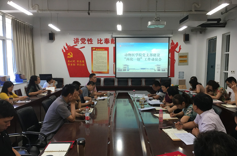 会上,党总支书记王春明首先传达了校党委书记穆瑞杰、副书记李波在纪念建党98周年七一表彰暨“两化一创”动员会上的讲话精神,带领大家一起学习了学校《关于印发〈党支部建设“两化一创”工作实施方案〉的通知》(校党【2019】49号)文件。党总支副书记张瑞春书记传达了动物医学院党支部“两化一创”工作实施方案。