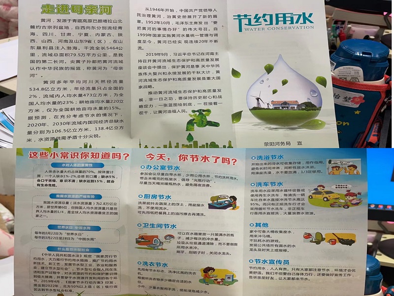 活动当天,荥阳河务局向我院赞助宣传材料600份。在宣传活动开展之前,荥阳河务局负责人对我院志愿者进行简单培训,科普了“世界水日”的背景和起因,讲解水资源的重要性,详细讲解地下水这种隐藏资源,分享生活中节水小技巧。3月22日中午,在做好疫情防控的同时,我院青年志愿者在校园内向同学们发放“世界水日”主题宣传单,向大家宣传关于世界水日以及保护水资源的相关知识,使同学们了解到当代水资源短缺现状,让大家意识到节约用水的重要性,进一步增强同学们节水意识、环保意识。同时,志愿者们走进宿舍与大家亲切交流,指导大家在日常生活中节约用水的方式方法,营造了爱水、节水、惜水的浓厚氛围。