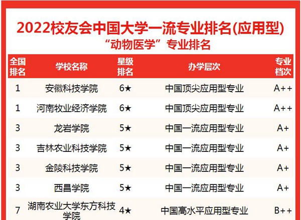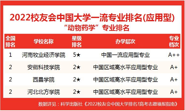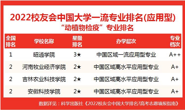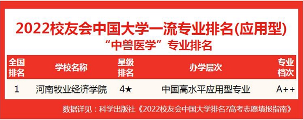 2022年3月30日,全国第三方大学评价机构艾瑞深校友会网(Cuaa.Net)撰写完成、科学出版社出版发行的《2022校友会中国大学排名高考志愿填报指南》最新发布校友会2022中国大学一流专业排名中,我校动物医学、动物药学、中兽医学3个本科专业荣登校友会2022中国大学一流专业排名(应用型)榜首、动植物检疫专业位居全国第二。