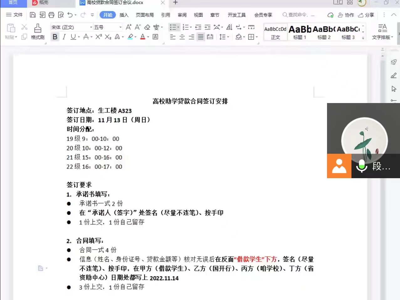 11月14日,段老师带领院勤工资助服务中心学生干部组织190名高校贷款学生分批在善知楼A323会议室签订了贷款合同。向同学们发放《高校助学贷款借款合同》和《高校助学贷款承诺书》,指导学生仔细阅读合同和承诺书,确定无误后在合同及承诺书上签字、按手印,并逐一检查全部收回。
