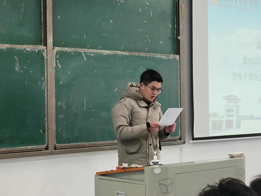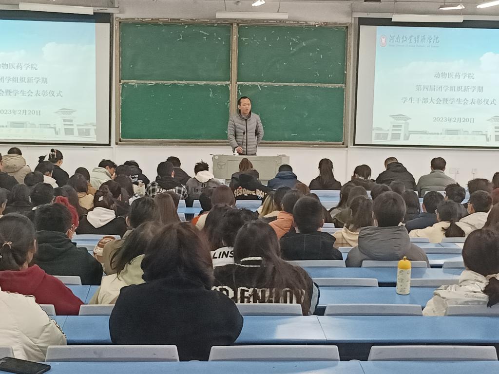 扬新帆,踏巨浪,再起航。为部署新学期工作,表彰优秀学生干部,进一步推动团学工作制度化、规范化、科学化,做好学生管理和服务工作,动物医药院于2月20日中午12:40在尚严楼合300召开第四届团学组织新学期学生干部大会暨学生会表彰仪式。本次会议由院团委副书记陈雁雪主持,院党委副书记汪洋,团委副书记付文凯、闫一博,全体辅导员参会指导工作,团学组织主席团、全体学生干部及各班班长团支书全部到会。