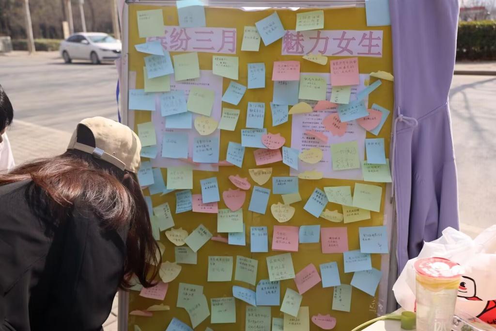 本次活动一共包含三个项目,第一个项目“幸福速递”,女生将自己的祝福张贴在留言板,展现积极向上的状态,与同学们共同分享,将幸福从字里行间传递给每一个同学,并且所有参与的同学都可以领到糖果,也将甜美带给自己。第二个项目“校园之美寻宝”,同学们通过在校园内寻找带有字样的牌子,组成“爱我医药,一生荣耀”,即可兑换领取到精美小礼品。第三个项目“同心共相识”,男女同学配对成搭档,男同学们帮助女同学进行打水、占座位、送早餐等日常性帮助,加强男女生之间的交流,是同学们能够更加地互相了解彼此,丰富了大学生校园生活,收获到了祝福和温暖,形成健康和谐的校园氛围。
