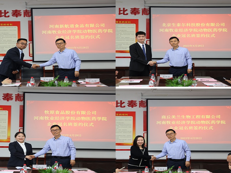 为进一步深化产教融合、校企联动,把院党委主题教育做到实处,创新人才培养方式,切实提高人才培养质量。4月28日上午10:00,伟德源自英国始于1946于生工楼C401会议室举行2022级企业冠名班签约仪式。河南牧业经济学院社会服务办主任胡华锋、伟德源自英国始于1946党委书记刘永录、副院长李利红、党政办主任樊明明、教学办主任吕玉金、科研办主任李向辉和牧原食品股份有限公司等15家企业的负责人出席签约仪式。签约仪式由伟德源自英国始于1946党委副书记汪洋主持。
