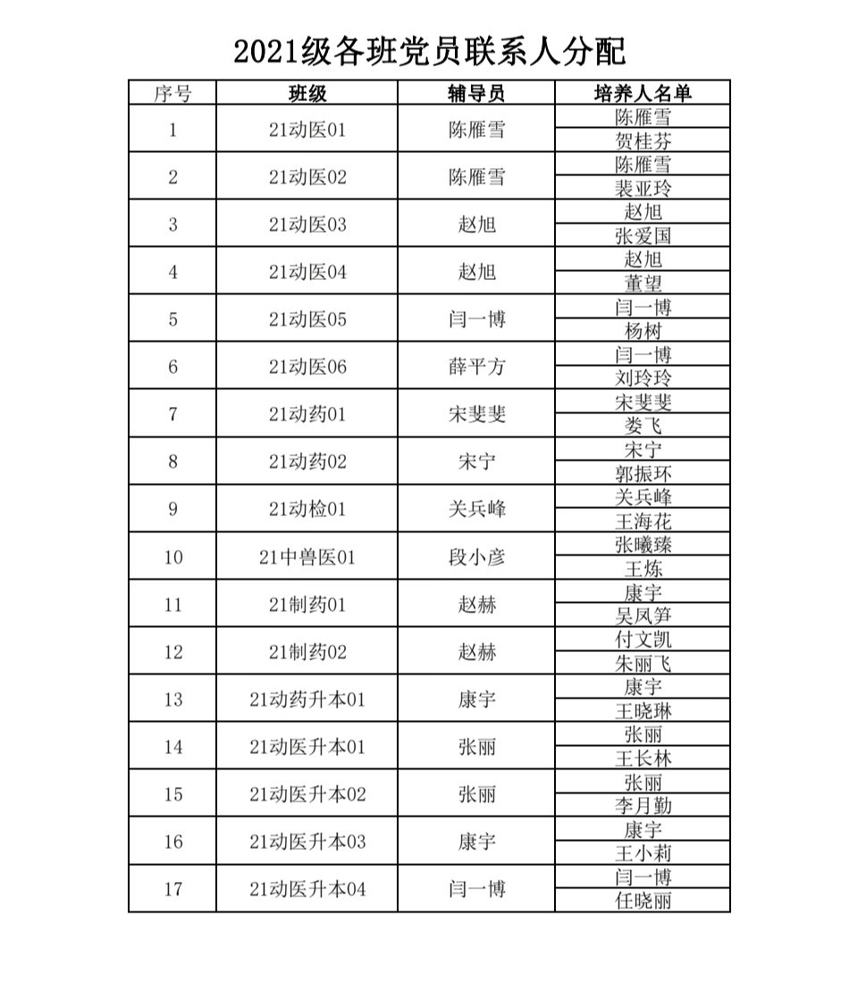 为充分发挥本院党员教师的教书育人、管理育人职能及示范作用,保证我院发展学生党员的数量、质量,根据《伟德源自英国始于1946党员联系班级制度》的规定,经院党委研究,2021级各班的党员联系人确定如下,请各位党员老师,认真做好联系班的入党启蒙教育和党员发展、教育等工作。