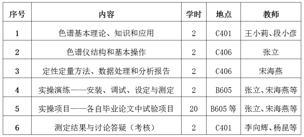 高效液相色谱仪原理构造、软件使用及上机操作。紧密结合学生毕业论文,以完成试验项目为驱动开展实操训练。计划理论8学时,上机学时为22学时,共计30学时。
