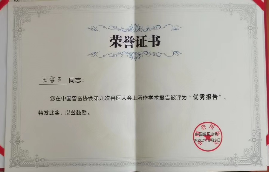 2022年9月2日-4日,中国兽医协会第九届兽医大会在山东省青岛市召开,主题为“提升兽医技术服务水平,促进畜牧业高质量发展”。我院王雪飞博士受邀参会。