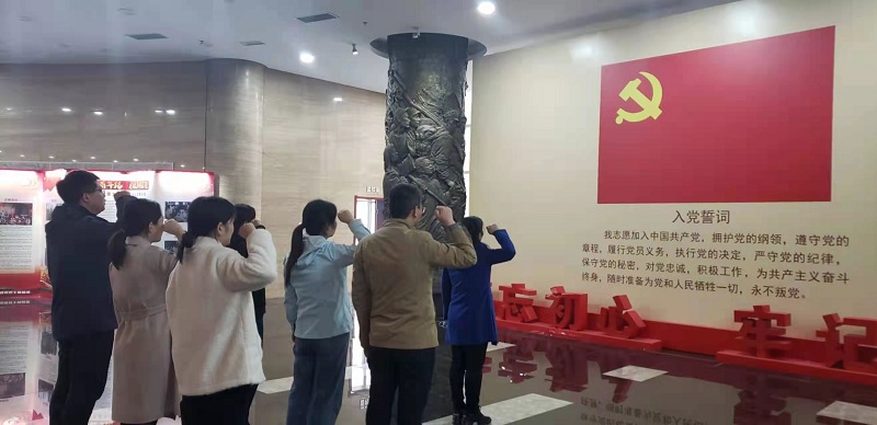 支部党员教师怀着崇敬之情,走进中原英烈纪念馆,参观了抗日战争厅、解放战争厅、大革命与工人运动纪念厅、土地革命厅等10余个展厅。老师们驻足于每一个展厅,神情凝重,被一幅幅英烈的照片、壁画所震撼,被一个个感人的英烈故事所感动,从抗日战争、解放战争时期到当代扫黑除恶,老师们深刻感受到了中原英烈们的英雄壮举。吉鸿昌、彭雪枫、杨靖宇、焦裕禄、任长霞……革命先烈们在血雨腥风的岁月里,抛头颅、洒热血,赴汤蹈火,舍生取义,为中华民族的独立和伟大复兴立下的不朽功勋。纪念馆大厅党旗前,在支部书记郭素琴老师的领誓下面向党旗全体党员重温入党誓词。