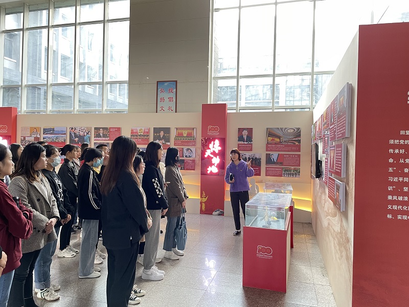 展厅内,大家边走边看,认真聆听讲解员讲解,了解展览的一个个生动故事和重大历史意义。展览通过以中国共产党的诞生、土地改革、抗日战争、新中国成立四个历史时期为时间线,使用了大量的图文材料还原了重大历史事件,让党员们深入了解了中国共产党从1921年建党到现在走过的100年光辉革命历程。辅导员付文凯老师有感而发:“回顾百年的风雨岁月,从嘉兴南湖的一叶红船,到井冈山的星星之火,从万里长征的艰难险阻,到八年全面抗战胜利,从解放战争的势如破竹,到新中国的开天辟地,从改革开放发展前行,到踏上全面小康社会的崭新征程,可谓风雨沧桑、波澜壮阔、灿烂辉煌,有无数共产党员为此流下艰辛的汗水甚至付出生命,才换回我们今天的幸福生活。”