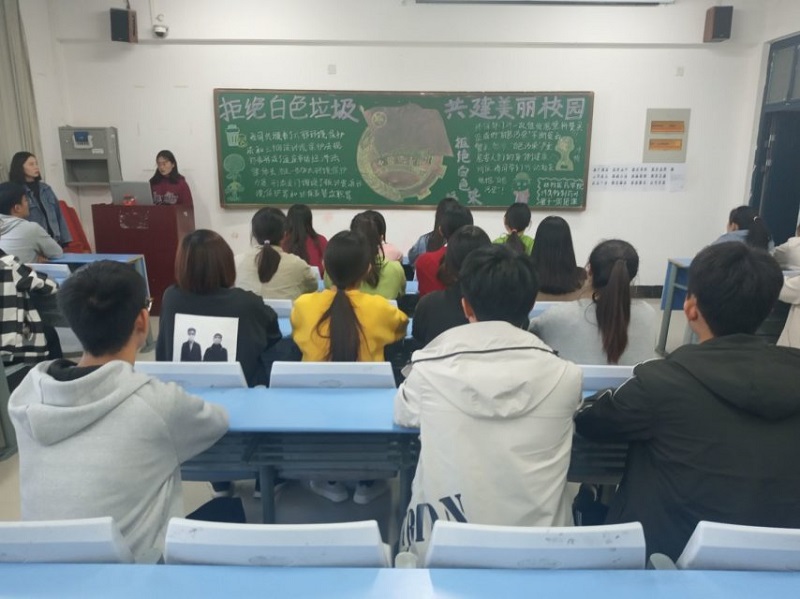11月14日下午2:30我院组织19级学生于各班固定教室开展以“拒绝白色垃圾,共建美丽校园”为主题的团课活动。