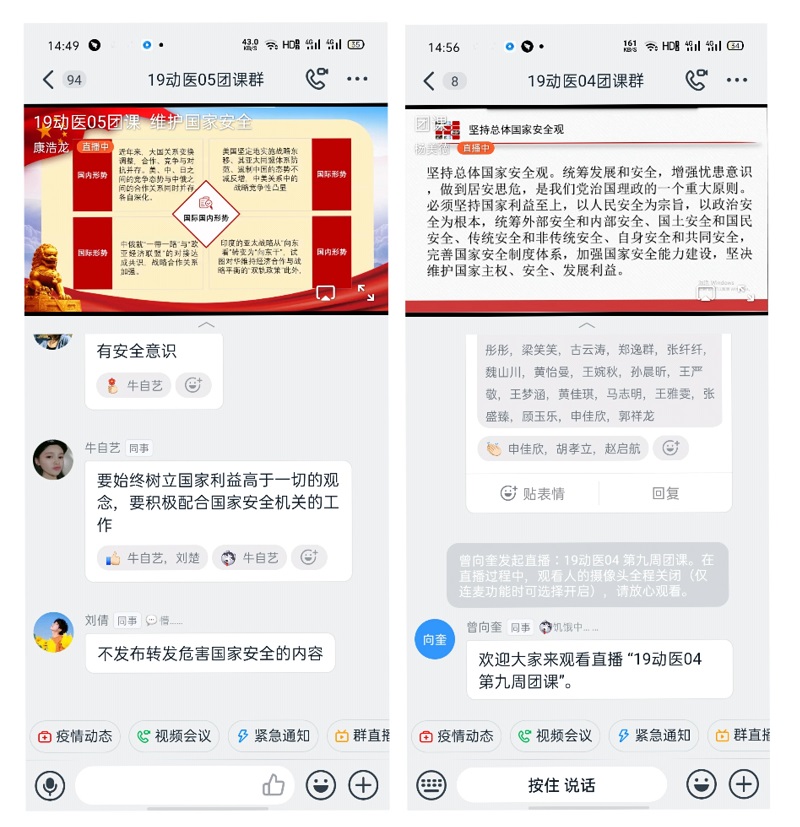 本周团课各团支部均采用直播的形式开展。首先,为提高同学们对于国家安全内容的了解,各班团课主持人与同学们共同学习交流国家安全法的内容和维护国家安全的核心。同学们了解到国家安全工作应当坚持总体国家安全观,以人民安全为基础,以政治安全为根本,以军事、文化、社会安全为保障,要构建国家安全体系,走中国特色国家安全道路。接着,就如何维护国家安全做出提问,同学们积极连麦讲出自己的看法,表示要想具备安全意识,就要了解我国的兴衰得失以及当下的国际形势和时事动态,从而增强自己的忧患意识和保卫祖国的责任感。最后,就青年人要勇于担当做出举例,90后、00后的白衣天使们为了维护国家安全,坚持抗疫,勇于担当!同学们深切地体会到青年人要坚定信心,在祖国需要时,扛起大旗,贡献力量!