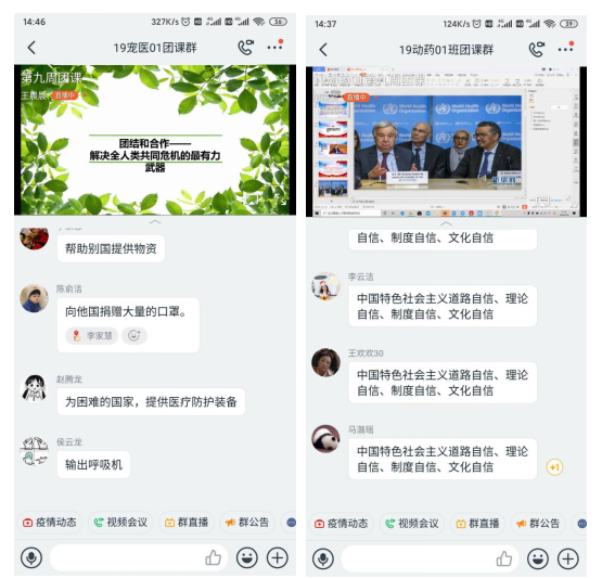 首先,由各班团课主持人组织本班同学学习新华网发布的《书写共建人类命运共同体的战“疫”篇章》,同学们深切地了解到习近平总书记作为大国领导人的远见和担当,认识到了只要我们经受住疫情的考验,中国与世界的友谊就能不断升华,中国与世界的合作就会更加坚固。紧接着,针对习近平总书记提出的“四个自信”、“构建人类命运共同体”的内涵进行学习,让同学们对于我国提出的“守望相助,同舟共济”的相处之道进行思考,同学们积极讨论,支持并坚定中国参与全球战“疫”的立场:以身作则,以行践言;恪守国际道义,践行大国担当。最后,全体同学线上观看由新华社发出的战“疫”篇章的视频,同学们在消息栏处发表自己的看法,表达自己作为中国人的自豪感!