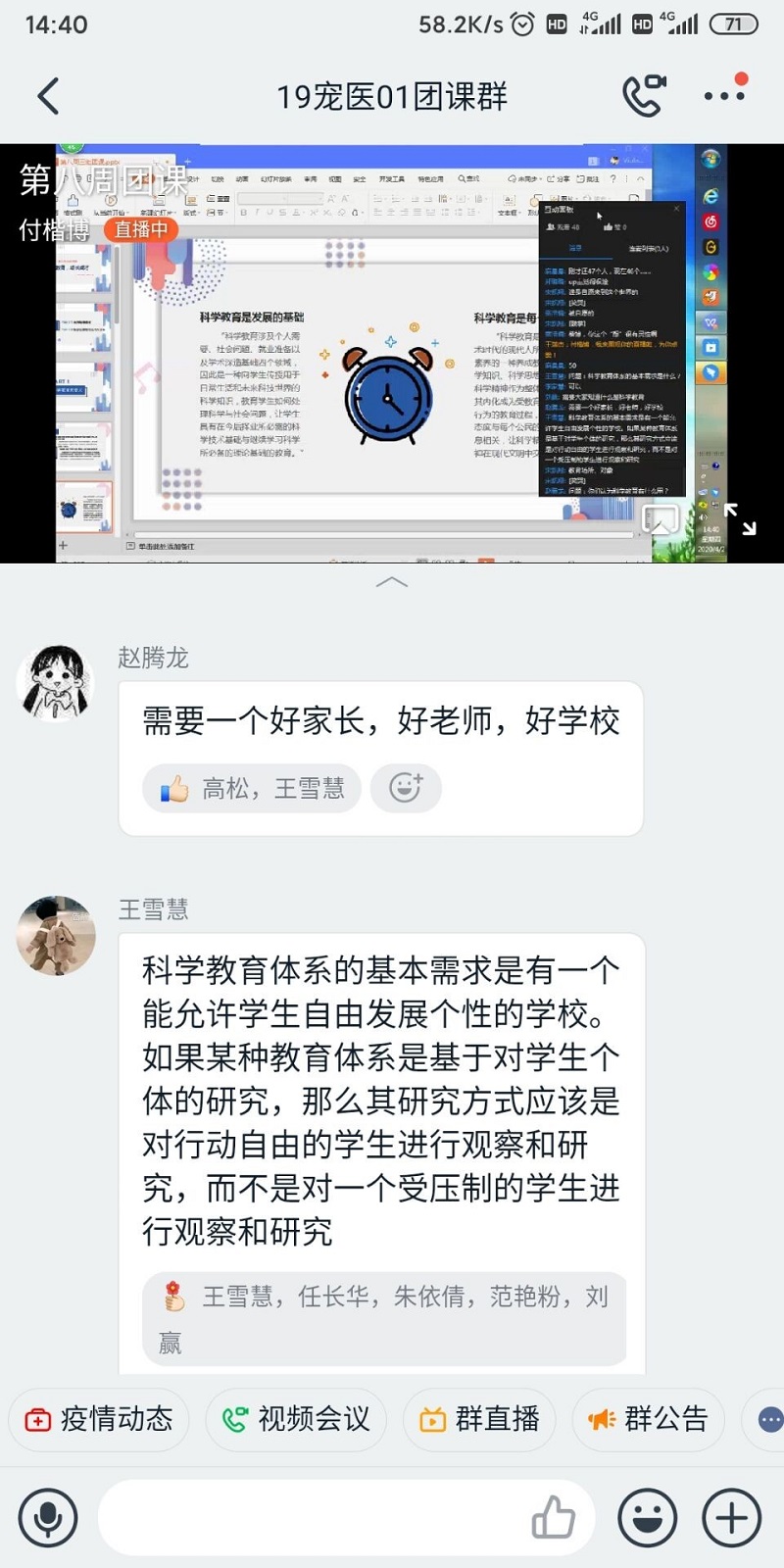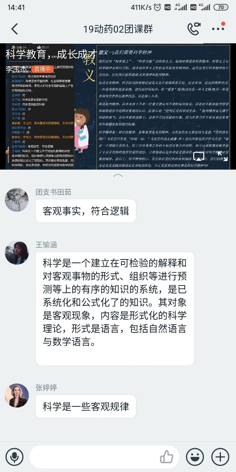 本周团课各班均采用直播的形式开展。首先,各个团支部围绕科学教育主题进行了广泛的讨论,同学们表示,要培养自律意识,增强自我学习的能力,并集中学习新冠病毒的科学防疫知识。紧接着,由各班主持人针对接受科学教育而成长成才的优秀人物进行介绍。在这其中不可或缺的当然是在疫情爆发之后勇敢的“逆行者”们,如钟南山院士、李兰娟院士等,他们享有科学教育,身上所具有的大爱品质正值得同学们学习。最后,由主讲人引导同学们用身边的实例和自己所掌握的资料通过连麦的方式向大家讲解,在团员代表发言的过程中,同学们积极参与,认真讨论,为本次团课增加了一份活力!