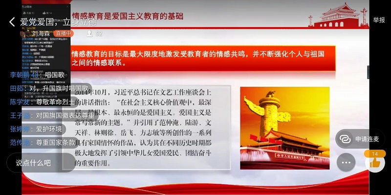 本周团课各班均采用直播的形式开展。首先,由主持人简要介绍了中国共产党的历史,针对作为大学生的我们如何做到爱党爱国提出了问题。同学们踊跃发言,表现出正确的政治观念和乐观的生活态度。紧接着,各班主持人结合当前我国疫情防控工作取得的阶段性胜利,指出在中国共产党的领导下,各级政府和相关部门坚决服从党中央统一指挥、统一协调、统一调度,一方有难,八方支援,体现了了中国人民的责任和担当,也充分展示了中国特色社会主义制度的显著优势。最后,主持人对本次团课作出系统的总结,希望大家通过本次团课对党的理论知识的学习,能够坚定自己的爱国理念,能够明白作为青年的我们要懂得感恩,积极向上,珍惜现在来之不易的美好生活!