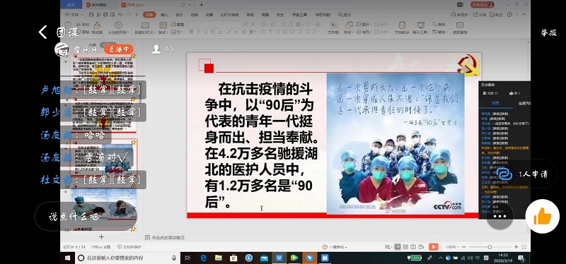 3月19日下午两点半至四点,我院组织19级各班在钉钉团课群中开展了主题为“学习总书记回信精神,致敬最美青春力量”的团课活动。