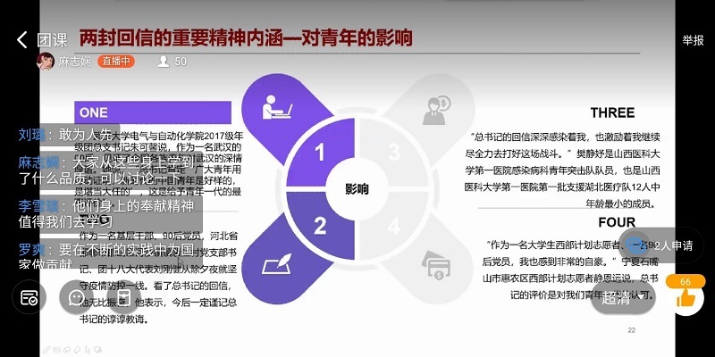 团课上,各班主持人组织本班同学学习“习近平给北京大学援鄂医疗队全体‘90后’党员的回信”和“习近平总书记给在首钢医院实习的西藏大学医学院学生的回信”,同学们认真学习回信的内容,纷纷表示,作为团员青年的我们要坚定理想信念、练就过硬本领,让青春在党和人民最需要的地方绽放绚丽之花。紧接着,团支书组织大家在线收看由中国人民大学王向明教授主讲的《全民战疫与坚定中国特色社会主义制度自信》网络团课,旨在引导团员青年充分理解国家制度优势,增强制度自信,培养家国情怀,真正与祖国一同成长。最后,由主持人借用习近平总书记在统筹推进新冠肺炎疫情防控和经济社会发展工作中的一句话进行总结,中华民族在历史上就经历了很多磨难,但从来没有被压垮过,而是愈挫愈勇,不断在磨难中成长,在磨难中奋起。