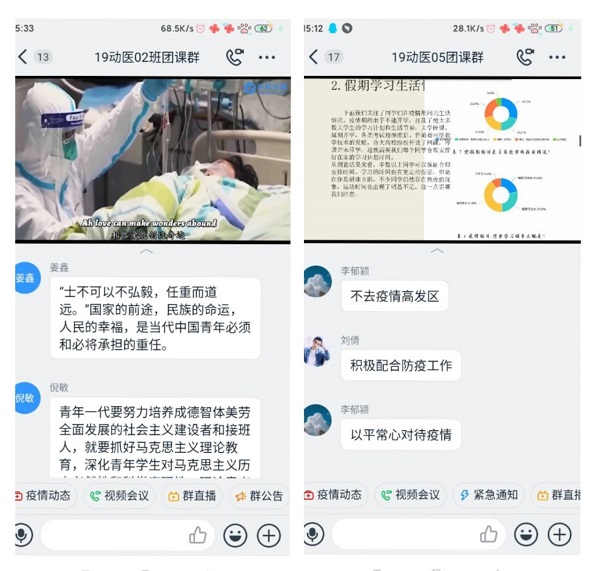 本周团课各团支部均采用直播的形式开展。首先,各班主持人带领同学们学习学校官网疫情防控专题网的“返校复学期间学生心理健康防护指南”、“大学生心理健康大讲堂”等资源,帮助同学们在疫情时期调整心态,积极面对生活、学业与职业发展。紧接着,主持人结合两会和本次青年大学习学习理解了我国国家制度和国家治理体系的显著优势,增强制度自信,明确集中力量办大事是我们成就事业的重要法宝。从而促进同学们的心理健康素质与思想道德素质、科学文化素质协调发展。最后,主持人连麦同学们,大家一起讨论分享自己在疫情中是如何度过的,相互引导关心,给予同学们心灵的陪伴。