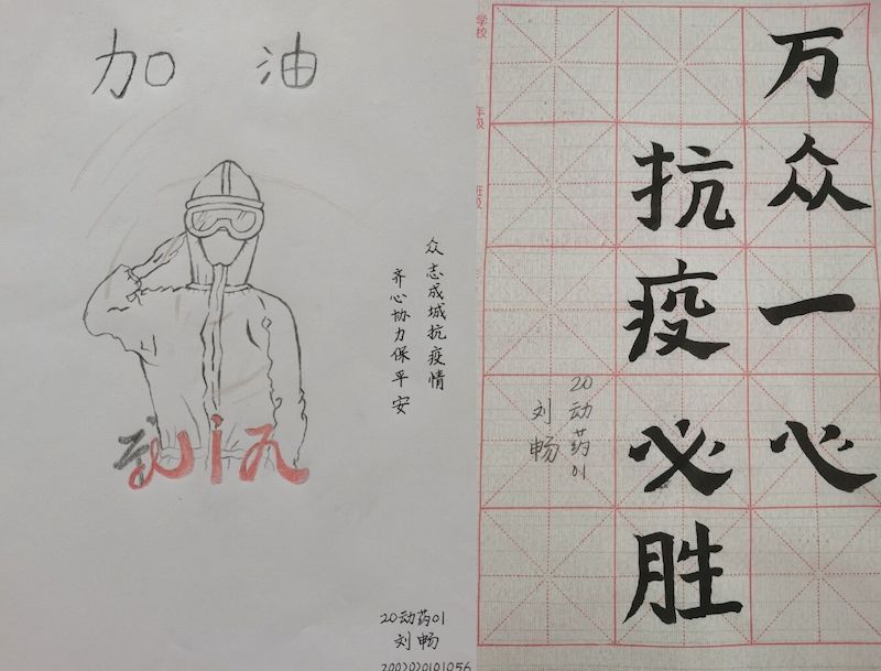 除了投入一线防控工作,许多大学生志愿者还通过录制歌曲、视频、书画作品等方式助力战“疫”,他们身体力行诠释了大学生志愿者的责任和担当。