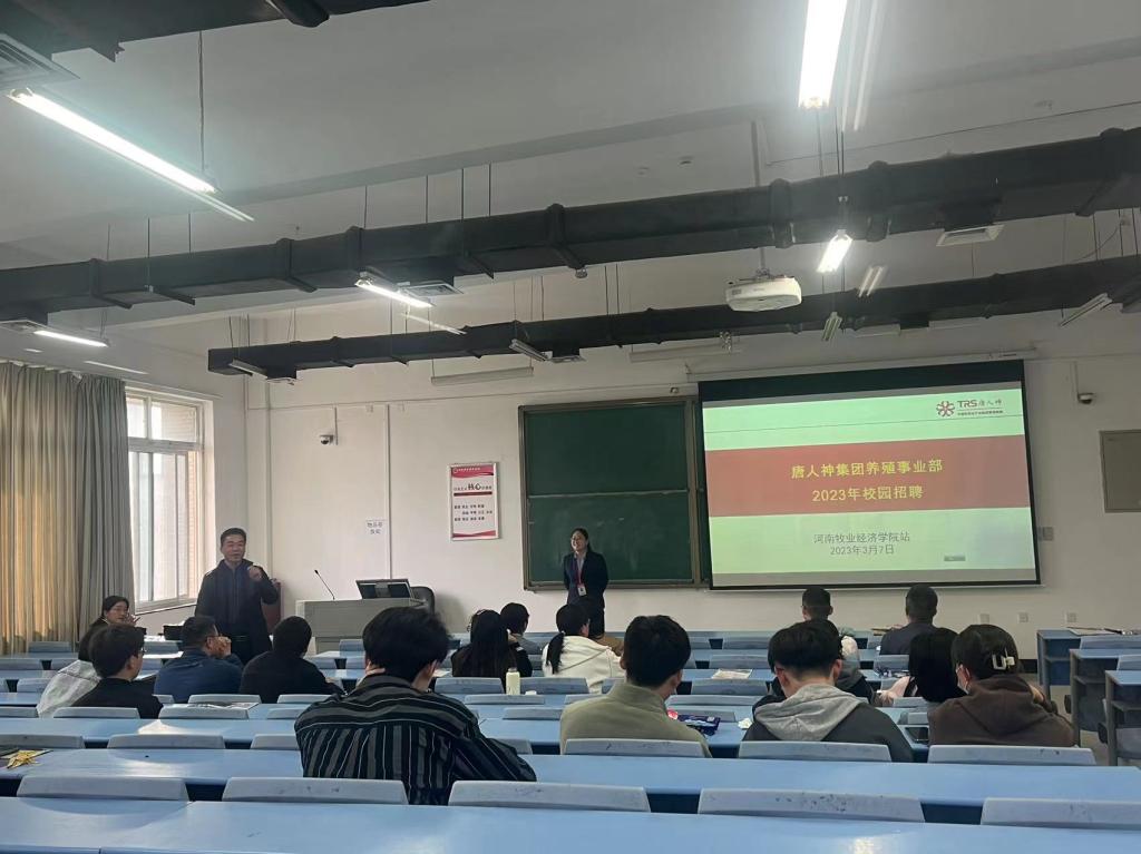 会议开始,企业负责人首先播放了唐人神集团的宣传片,随后,主讲人向大家讲述了唐人神集团的公司发展概况和行业发钱前景,唐人神集团拥有强大的技术实力和产品研发能力,设有国家级企业技术中心、博士后工作站、国家生猪核心育种场,培育的“美神”种猪通过了世界顶级的美国“NSR”认证,公司产品拥有广泛的客户群体和市场美誉度,具有广阔的就业平台、完善的培训机制、丰富的薪资福利。此外,还详细地介绍了唐人神集团在人才培养发展方面的具体情况和措施方法。最后,宣讲人和同学们就企业相关问题展开问答。