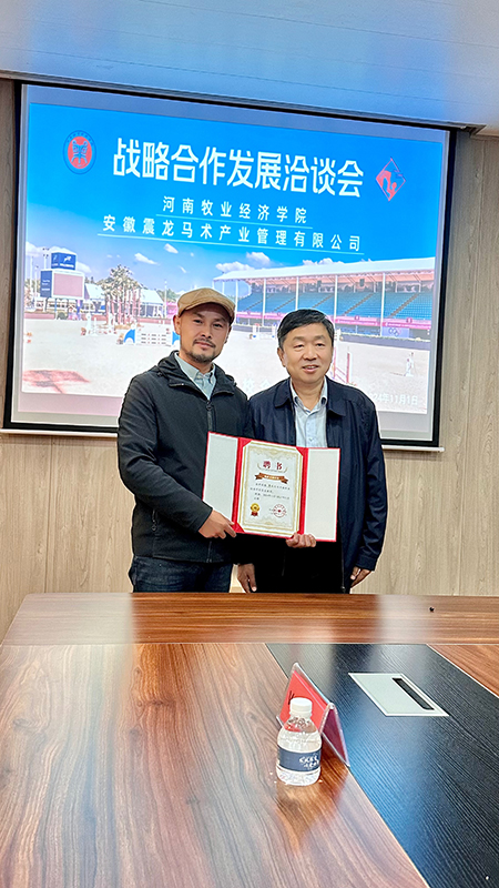 会议结束后,副校长边传周为安徽震龙马术产业管理有限公司授牌,并为陈阵董事长颁发客座教授聘任证书。